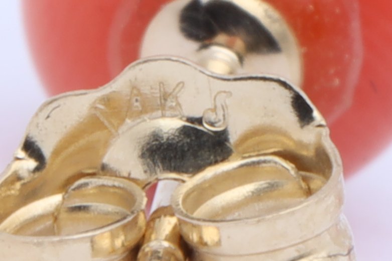 These earrings are a beautiful representation of fine craftsmanship. Made from 14k yellow gold, they feature coral balls held securely with butterfly backs. The earrings are marked with the maker's mark, a testament to their quality.