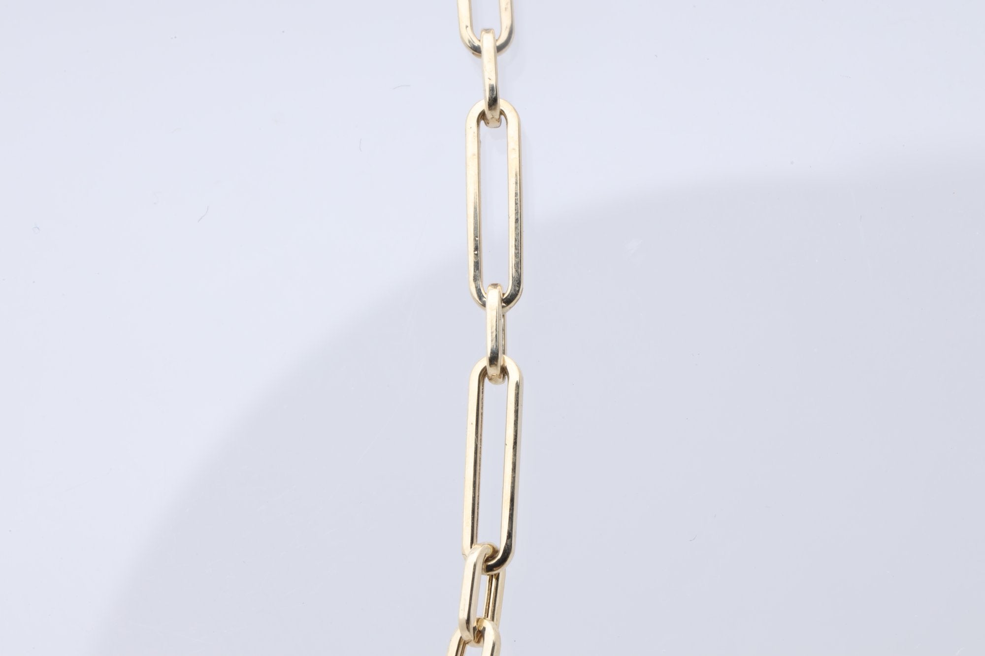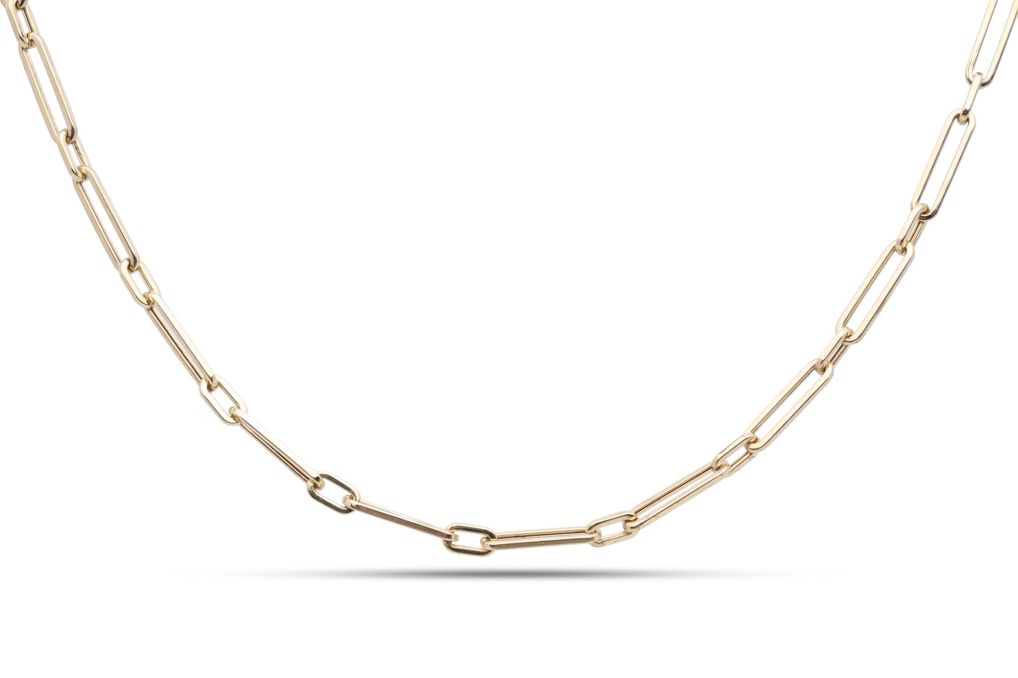 This 16'' paperclip chain necklace is a timeless piece, crafted from 14k yellow gold. The necklace features a lobster clasp for secure wear and is marked with the stamp '14kt'.
