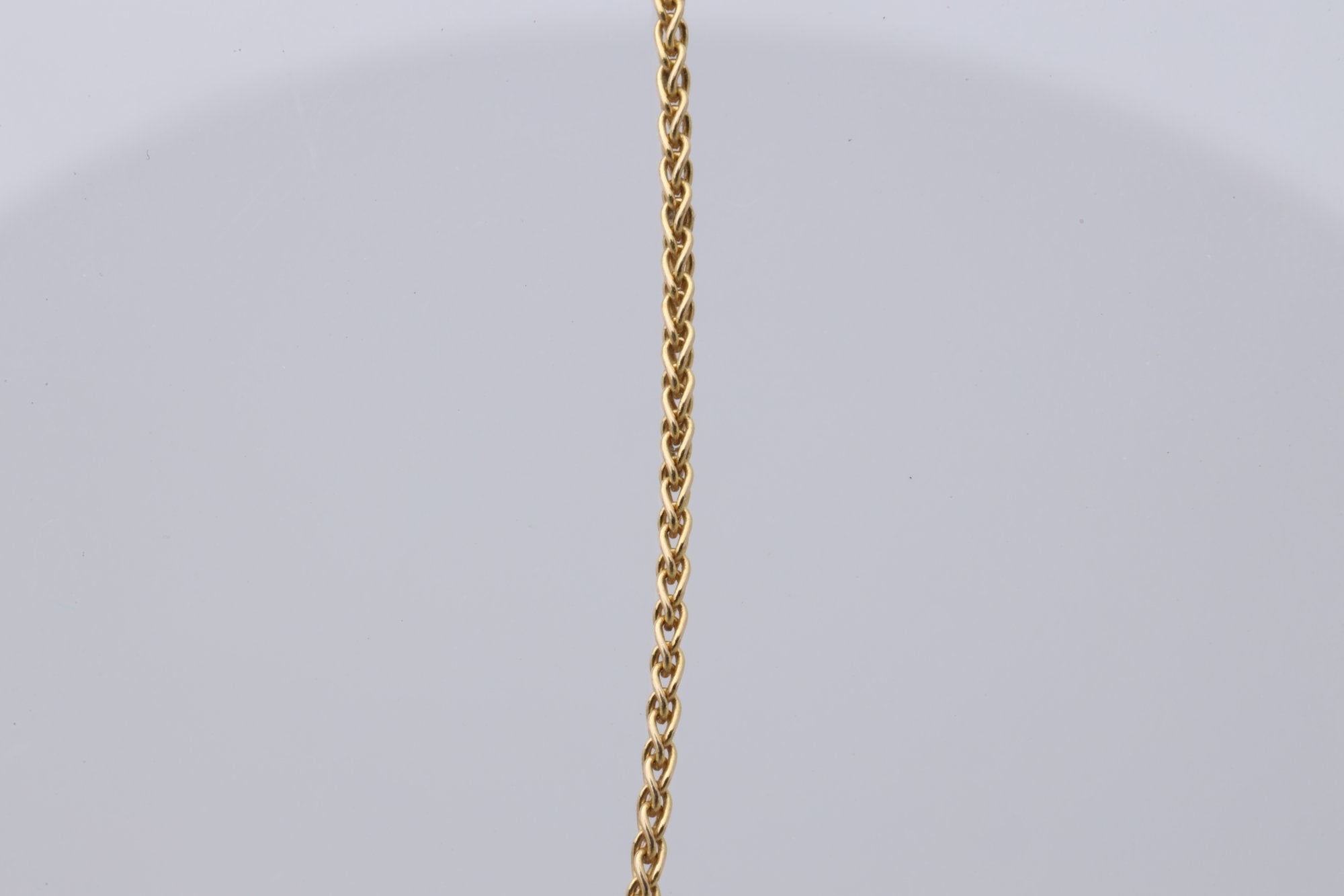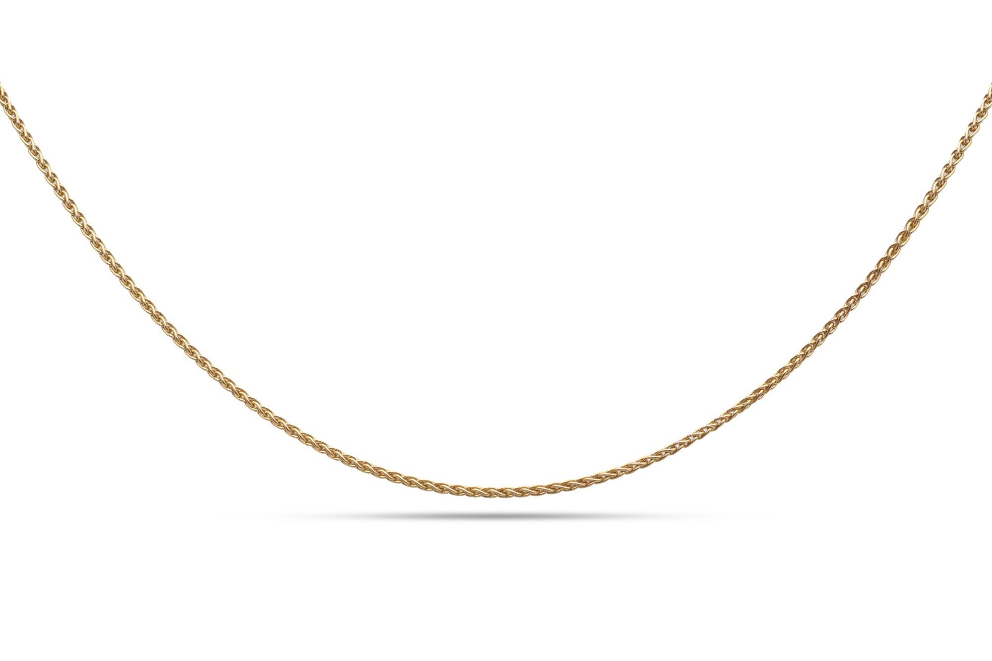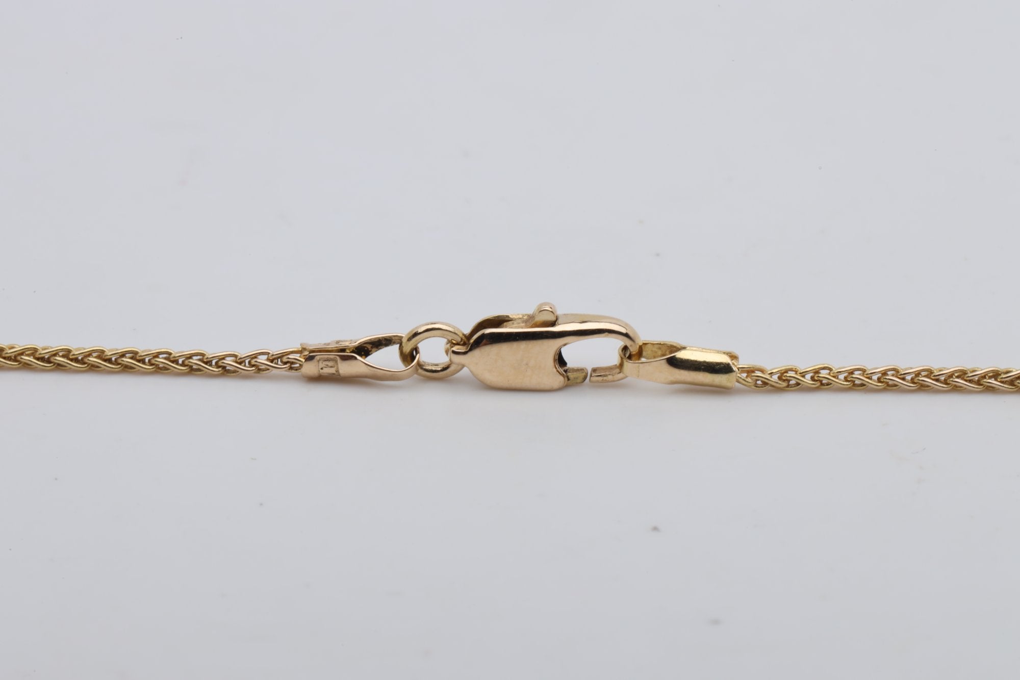 This 18'' wheat chain necklace is a timeless piece, crafted from 14k yellow gold. The chain features a lobster clasp for secure fastening and is marked with the stamp '14k'.