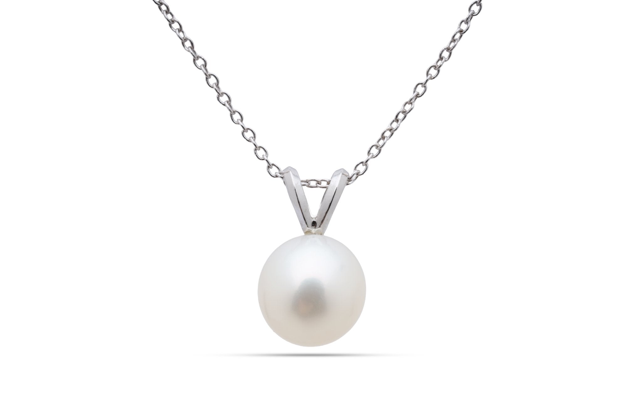 This elegant pendant necklace from Blue Nile features a single round white pearl, delicately suspended from a 14k white gold chain. The pearl's lustrous white color beautifully complements the cool sheen of the white gold, creating a piece that is both timeless and versatile.