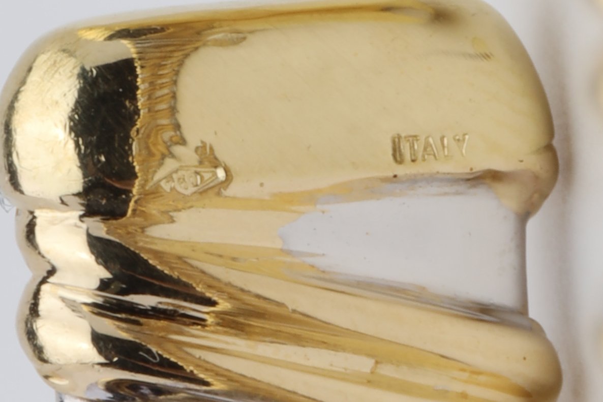 The bracelet measures 7.5 inches in length, 11.40mm in width, and 6.80mm in thickness. It bears the stamp '750' and the inscription 'ITALY', indicating its purity and origin. Despite slight signs of wear, the bracelet is in excellent condition (9/10).