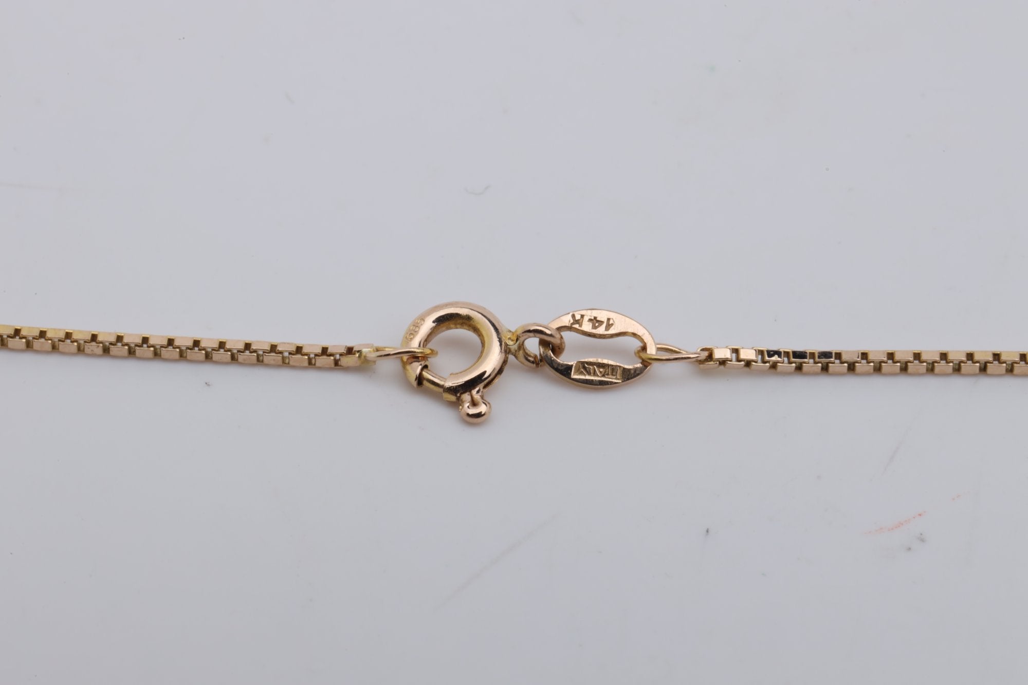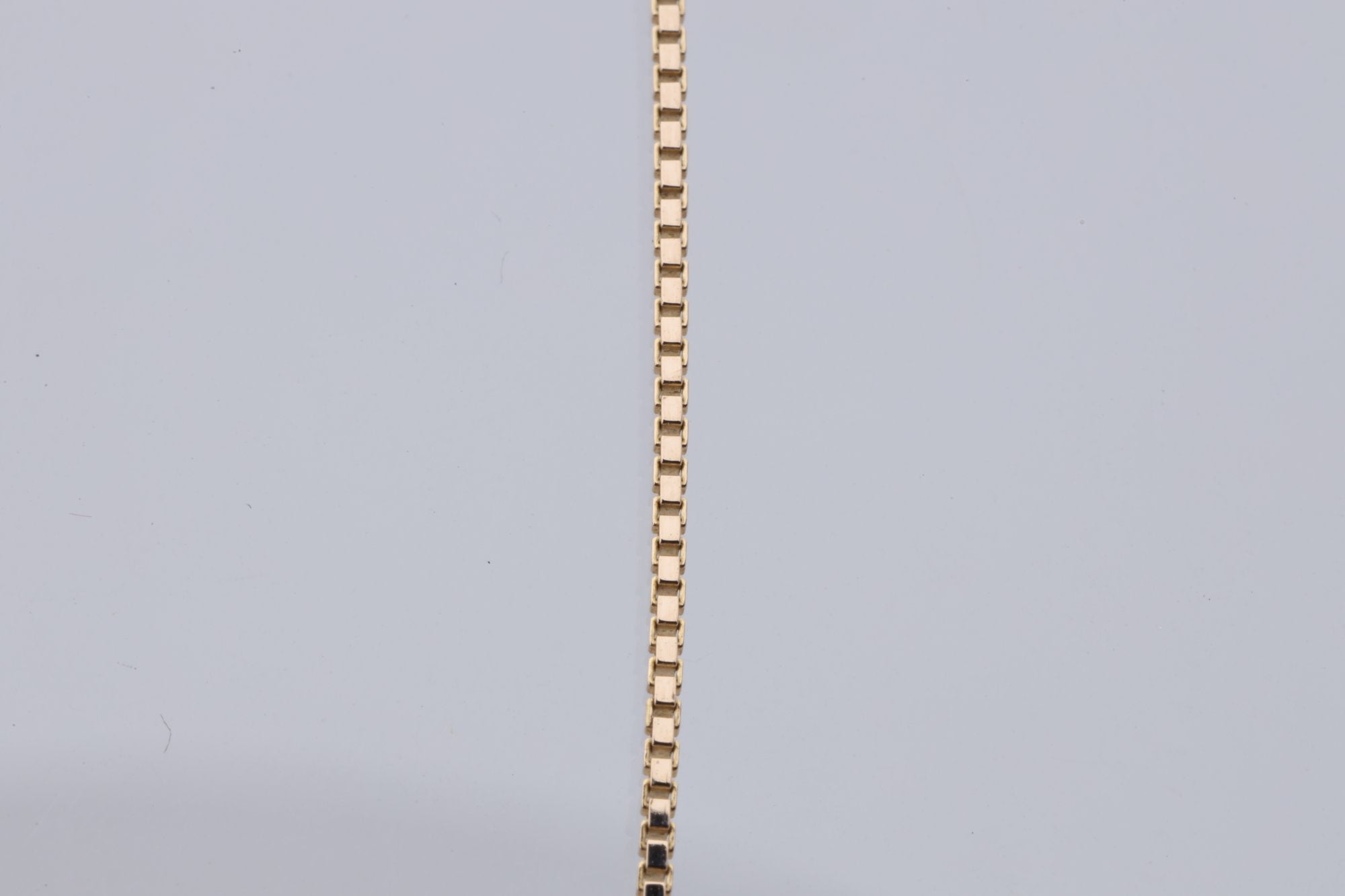 This elegant 19.5'' box chain necklace is a timeless piece, crafted from high-quality yellow gold. The chain features a secure spring ring clasp and is subtly inscribed with 'ITALY 585', a testament to its origin and purity.