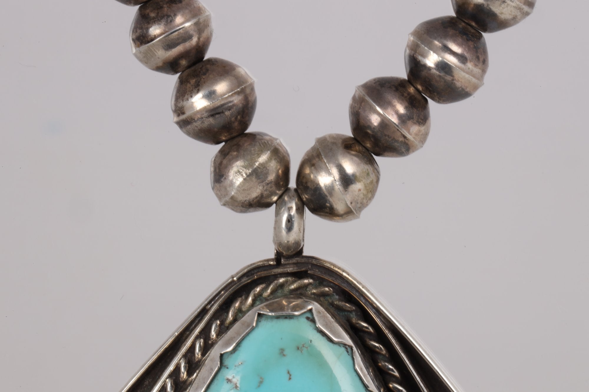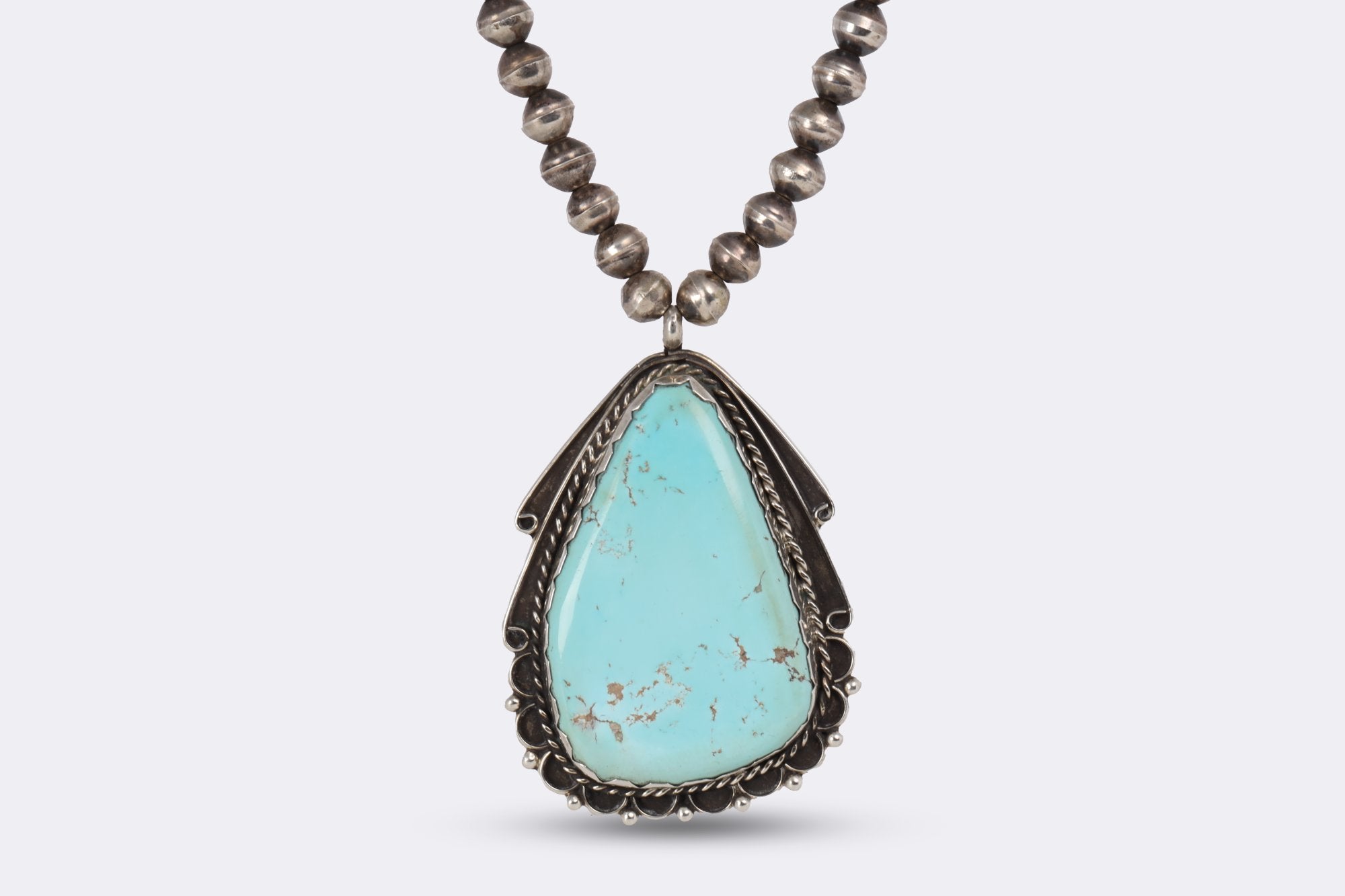 This 26'' necklace features a stunning triangular turquoise pendant, beautifully complemented by a beaded silver chain. The turquoise gemstone, weighing 15.85 carats, is the centerpiece of this piece, adding a pop of color to the silver backdrop.