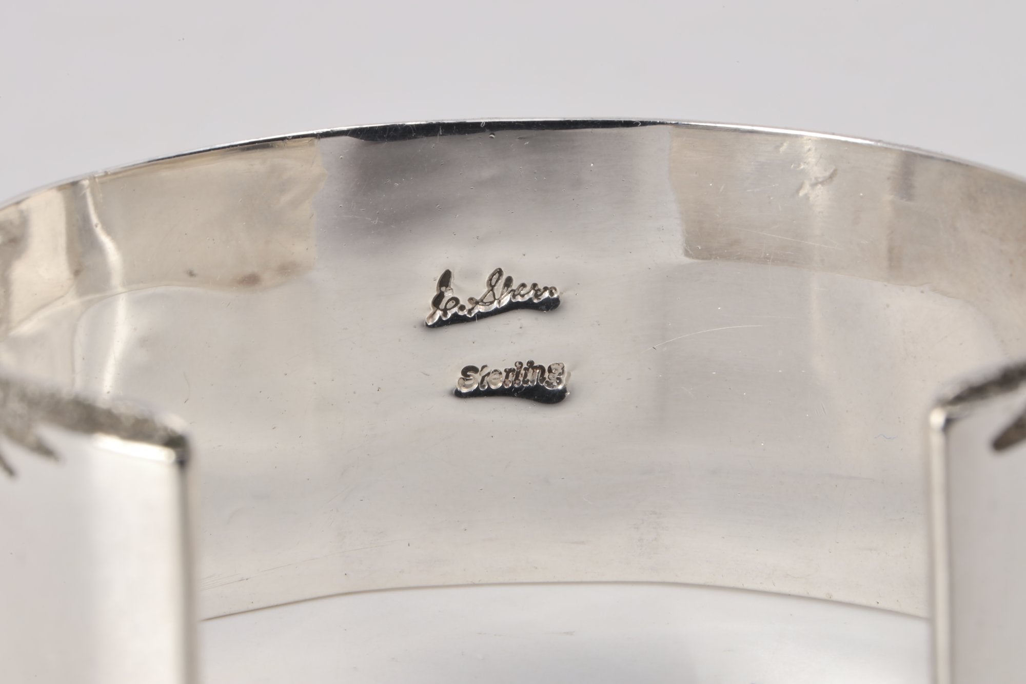This sterling silver cuff bracelet, designed by E. Sher, is a beautiful piece inspired by native artistry. It features 14 turquoise gemstones, adding a vibrant touch to the silver backdrop.