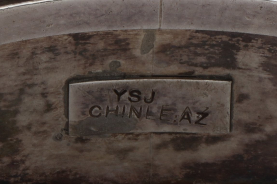 The bracelet measures 6.5 inches in length, with a width of 68.50mm and a thickness of 5.90mm. It bears the stamp 'AZ' and the inscriptions 'YSJ' and 'CHINLE', adding to its authenticity and uniqueness. Despite slight signs of wear, the bracelet is in excellent condition, reflecting its well-preserved nature.