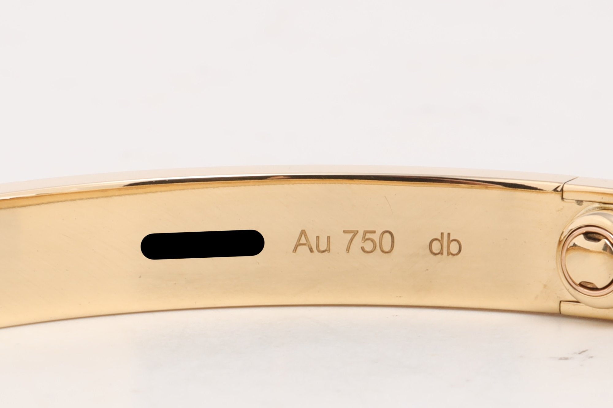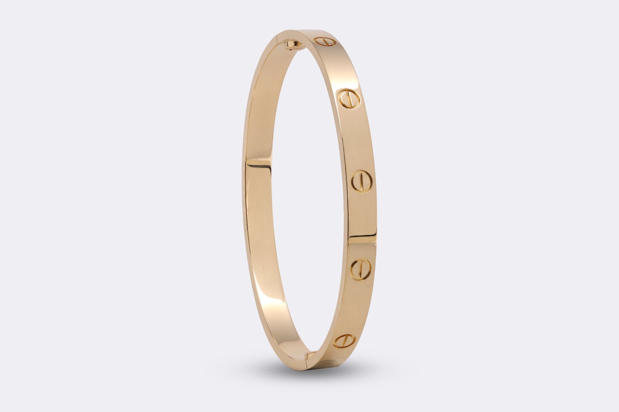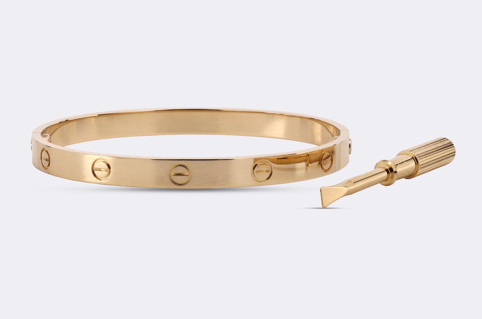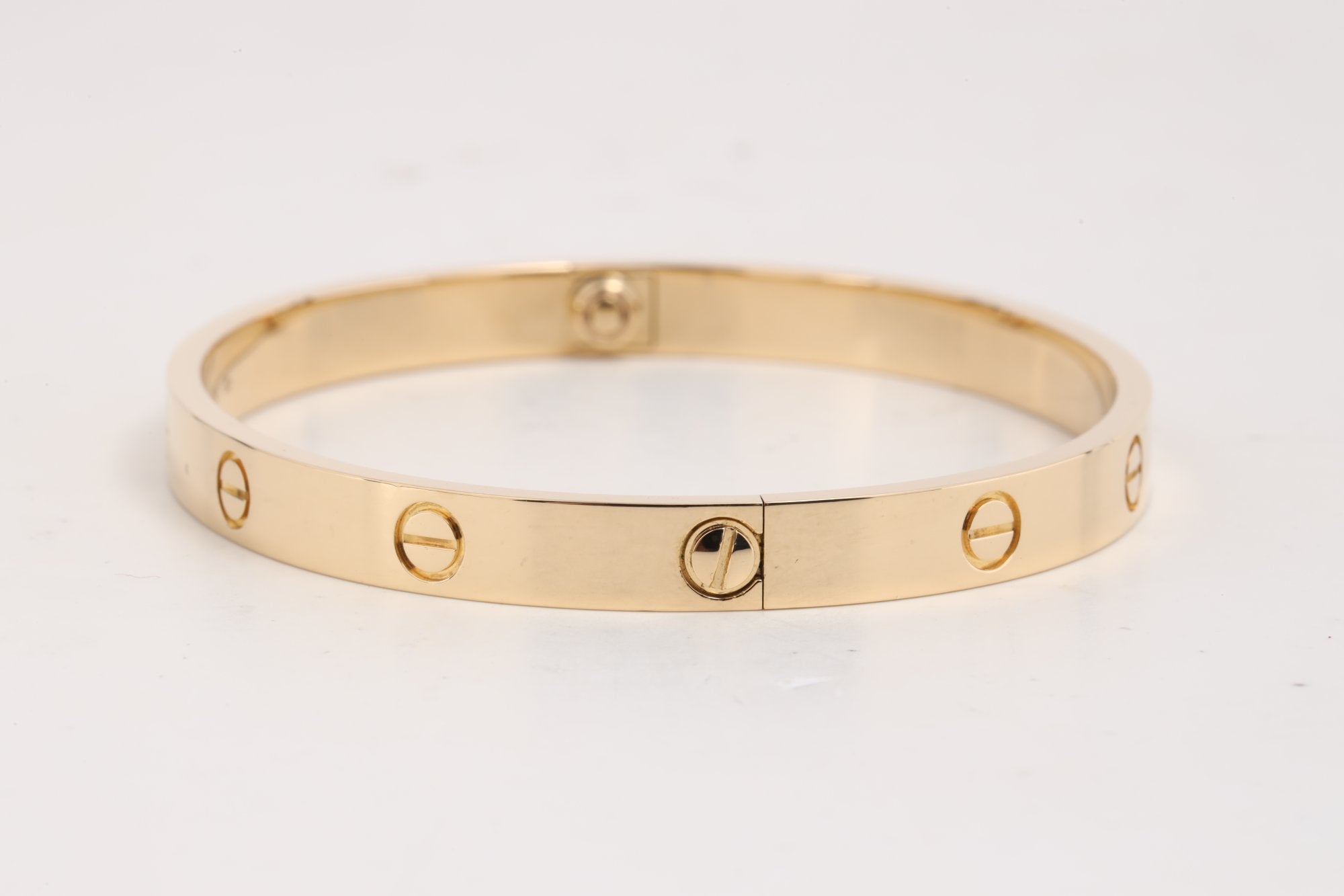 This classic model of the Cartier Love bracelet is a timeless symbol of love and commitment. Crafted in 18k yellow gold, the bracelet features the iconic Love design with a screw together clasp.