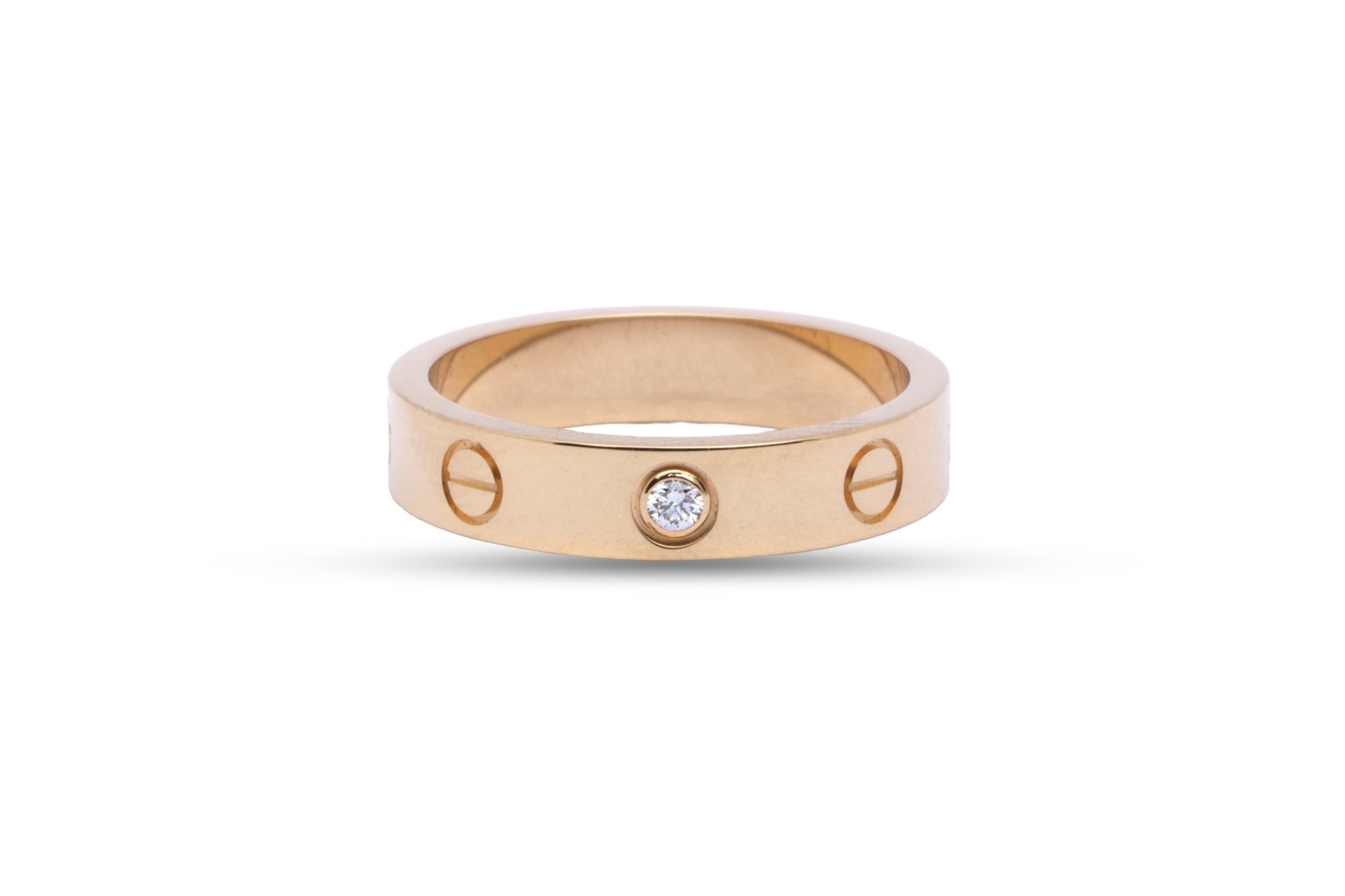 This exquisite piece is a Cartier Love ring, a timeless symbol of eternal devotion. Crafted from 18k yellow gold, the ring features a single round brilliant diamond, adding a touch of sparkle to the iconic design.