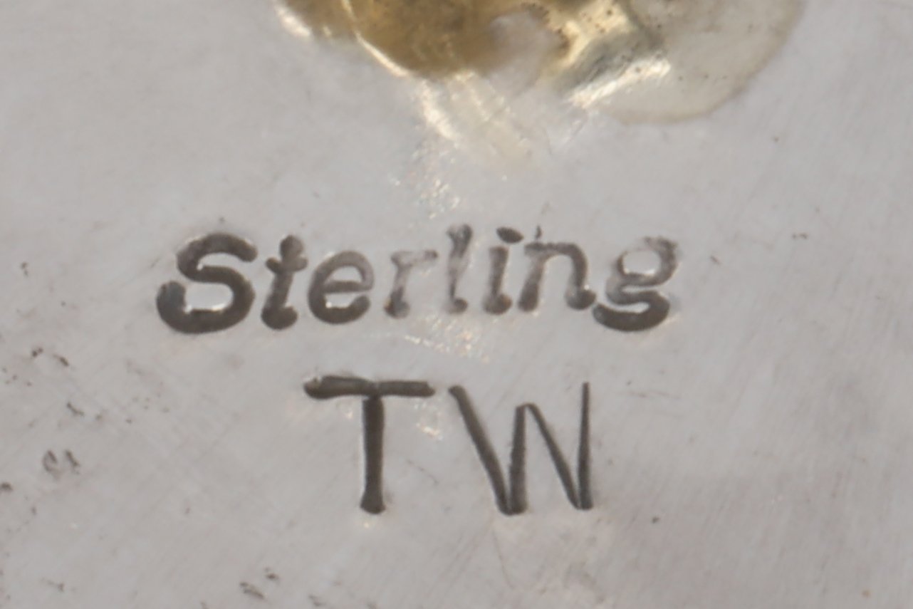 The earrings are marked with the stamp 'Sterling' and bear the inscription 'TW', a testament to their authenticity and the craftsmanship of Terry Williams. They are secured with butterfly backs, ensuring a comfortable and secure fit.