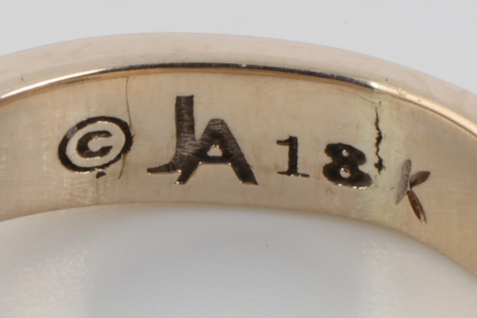 This vintage John Atencio bypass band ring is crafted in soft but luxurious 18k yellow gold and highlights the designer’s signature fluid, sculptural aesthetic. The elegant bypass form creates subtle movement and dimension across the finger, offering a refined yet distinctive look. Signed “JA” and fully original, this piece reflects the understated craftsmanship and timeless style associated with John Atencio’s designs.